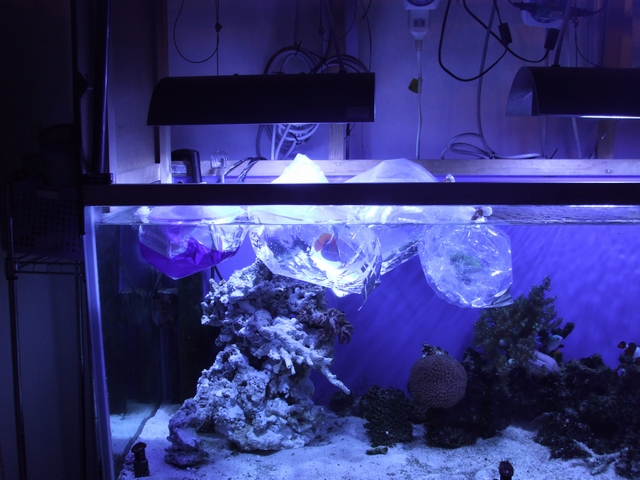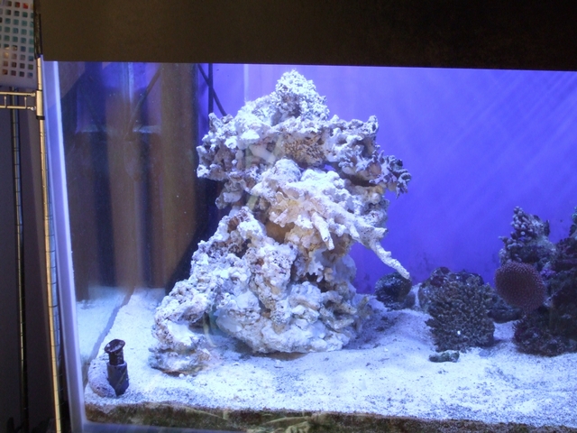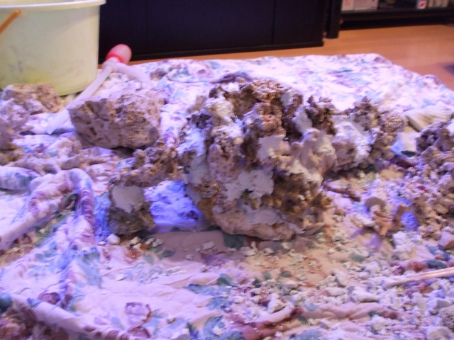放置し過ぎて華やかさの無くなってしまった我が家の水槽・・・。 ボーナス時期だし、どげんかせんといかん!!(古 という訳で水槽リフォーム中です。 前にライブロックが半分無い。と記事に書きましたけど、 実は天日干ししてまして。 んで、真っ白になったライブロックを・・・ ホワイトセメントでくっ付けてます(笑 こねこね・・・ペタペタ・・・・。 俺海も手伝ってくれたけど・・・ 固まりかけたセメントを破壊! ブチ切れですよ! (しかも壊した後、「じゃ俺帰るわ」ですって!) 作業時間は3時間ほど。 乾燥時間で1晩。 完成致しました! 左側にある白い固まりがこねこね、ペタペタした物体です。 ん~・・・ア・バオア・クーと名付けよう。 ア・バオア・クーのアップです。 んー!なかなかの出来栄えじゃないですか? ア・バオア・クーにはアーチなんかもあります。 要塞の中は空洞になっていて、魚達の隠れ場所です。 どうですか!?ホワイトセメント500円で貴方のデスロックも立派な水槽モニュメントになりますよ!? 後は右半分のライブロックを天日干しして、ホワイトセメントでソロモンを作ってレイアウトを完成させる予定です。 さてさて、まだ続きますよー。 今日は俺海とMさんと埼玉ショップ巡りに繰り出しました。 まず行ったのが・・・えーっと中古ショップ・・・えーっと・・・。 あまりにもしょぼくて名前忘れちゃった・・・(笑 2件目は「Aqua工房CoCo」 生態関係は少なめ。 状態はまぁ普通だったかな。 中古機材が店内至る所に置いてありました。 さっと流し見すると、掘り出し物を見逃す恐れあり。 近所なら通ってもいいかなぁって感じでしたね。 3件目は「イーストアフリカ」 移転準備中だとかで、機材?備品?は少なかったですね。 生態はストック・調子共に標準ってとこですかね。 ここである生態を2匹ほど購入しました。 いっぱい浮いてますけど、半分はMさんのです。 最後はB-BOX。 どうでもいいや・・・(笑 買い物終わっちゃってたし、魚の状態があまり良くなかったので店内の様子を見ただけでした。 んでイーストアフリカで購入したのは、 イナズマとエイブリー買ってきましたー! 久々の生態購入! アクアテンションが久々に↑↑になってます。 ウズマキが☆になってしまい、大型ヤッコ欲しいなぁと思っていたところ、5000円ちょいという価格に惹かれて購入。 餌爆食いで即放流でもよかったのですが、しばらく隔離して病気等無いか監視します。 エイブリーは水槽に入れたい魚だったので購入。 過去2匹?3匹?餌付けられず☆にしています・・・。 今回のも店で餌に反応なし・・・。 さてさて・・・餌付くかなぁ・・・。 (一応うちの水槽では食ってくれたので、大丈夫かな・・・) 爆食いになるまで隔離します。 と、まぁ久々に前向き?な海水魚記事でした!(笑 生態追加かソロモン完成時にまた更新します!